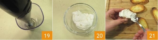 Batid con una batidora de inmersión 19 hasta obtener una salsa densa y cremosa 20. Sacad el salmón marinado del frigorífico y comenzad a componer las tostadas: untad la mayonesa falsa sobre las rebanadas de pan 21,