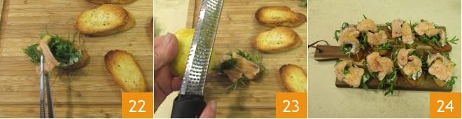 añadid un brote de rúcula, que habréis lavado y secado previamente, añadid un par de rodajas de salmón marinado 22 y un poco de ralladura de limón 23. Finalmente, condimentad con una pizca de sal y una pizca de pimienta rosa. ¡Vuestras tostadas con salmón marinado están listas para ser servidas 24!