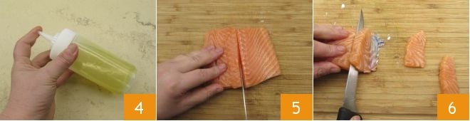 Agitad bien para emulsionar todo 4 y pasad al salmón, que primero cortaréis a la mitad a lo largo 5 y luego en rodajas de aproximadamente 1 cm de grosor 6.