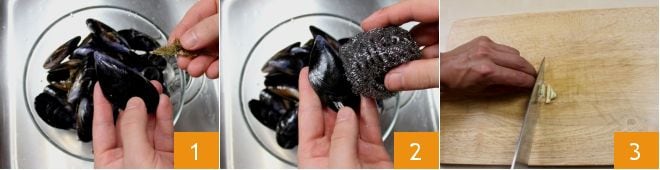 Para preparar las tostadas con mejillones, botarga y cáscara de limón comienza con la limpieza de los mejillones: también puedes consultar la Escuela de cocina Cómo limpiar los mejillones. Lávalos cuidadosamente bajo agua corriente, elimina el biso 1, es decir, la barba que sale de la concha y frótala con una esponja de alambre 2 o raspa con la hoja de un cuchillo. Pica finamente el diente de ajo pelado 3 y sofríelo en una sartén grande con un poco de aceite; si prefieres también puedes añadir guindilla fresca.