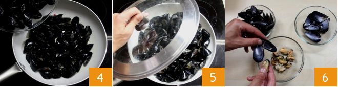 Vierte los mejillones en la sartén 4, mezcla y cierra con una tapa 5 para abrir las valvas: tomará alrededor de 5 minutos. Mientras los mejillones se cocinan, quita la parte amarilla de la cáscara del limón no tratado ayudándote con un cuchillo y redúcela a tiras muy finas. Cuando los mejillones se hayan abierto, escúrrelos y quítales las conchas 6.