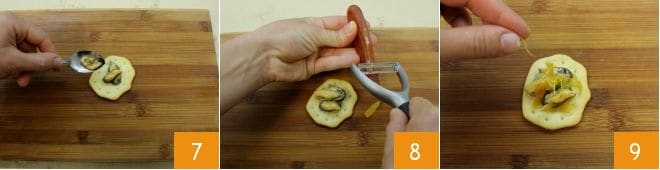 Puedes así componer tus tostadas, poniendo primero 2-3 mejillones en cada tostada 7; luego sigue rallando botarga de mújol 8 o de atún y decorando con algunas tiras de cáscara de limón 9. ¡Tus tostadas con mejillones, botarga y cáscara de limón están listas para ser disfrutadas!