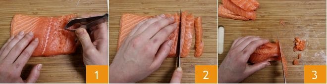 Para preparar las tostadas con tartar de salmón y cebolleta, primero asegúrate de haber comprado pescado congelado; se recomienda congelarlo durante 96 horas a -18 grados y luego descongelarlo para utilizarlo en la receta. Asegúrate de que no tenga espinas: pasa los dedos sobre la superficie y si hay espinas, retíralas con unas pinzas 1. Luego corta el filete de salmón en tiras 2 y después redúcelas a cubos muy pequeños 3. Pon los cubos en un bol pequeño y reserva en frío.