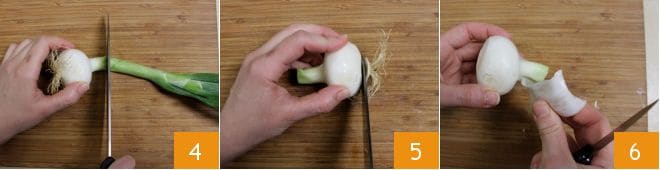 Prepara la cebolleta eliminando la parte verde 4 y las raíces 5; luego quita la capa exterior más dura 6.