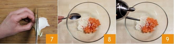 Corta rodajas muy finas 7, luego pícalas finamente y agrégalas al bol donde habías puesto los cubos de salmón 8. Rocía la cebolleta y el salmón con un poco de aceite de oliva virgen extra 9.