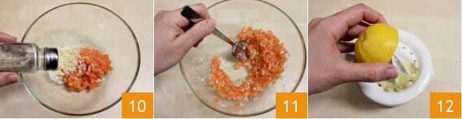 Sala y pimienta 10 al gusto, mezcla los ingredientes con una cucharita 11. Luego exprime medio limón 12.