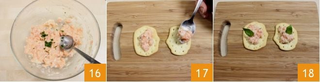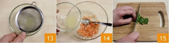Pasa el zumo obtenido por un colador y recógelo en un bol pequeño 13. Luego añade el zumo de limón a la mezcla de salmón y cebolleta 14 y deja marinar durante 5 minutos o hasta que el salmón adquiera un color más claro. Mientras tanto, pica finamente las hojas de albahaca 15,