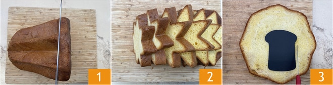 Para preparar la tostada francesa de pandoro con Nutella®, recorta un cartón en forma de rebanada de pan brioche. Luego corta el pandoro en rebanadas de aproximadamente 2 cm 1 2. Recorta las formas con la ayuda de un cuchillo, colocando sobre cada rebanada de pandoro el cartón 3. De las primeras 3 rebanadas obtendrás dos formas y una de las siguientes más pequeñas.