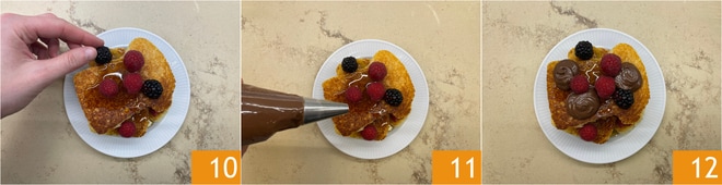 Decora con moras y frambuesas 10, rosetones de Nutella® con la ayuda de una manga pastelera 11. ¡Tus tostadas francesas de Pandoro con Nutella® están listas 12!