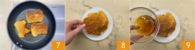 Necesitarás pocos minutos por lado, hasta que estén doradas 7. Emplata apilando 3 rebanadas para cada porción 8, rocía con jarabe de arce 9.