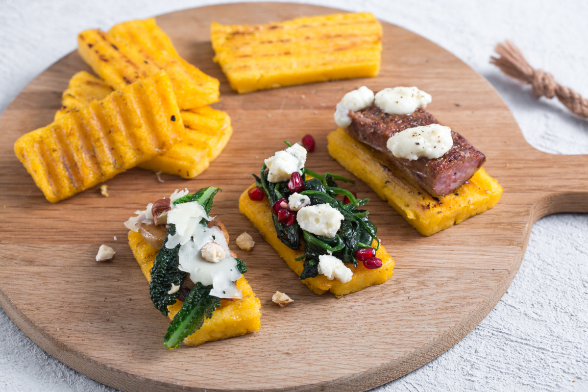 Con la polenta se pueden realizar muchos platos sabrosos, desde los más clásicos como la Polenta con salchicha y queso a los más particulares como las tostadas rústicas de polenta, perfectas también para el menú de Año Nuevo o como entrante de Navidad. Prepararlas es muy sencillo y también son una idea original para reutilizar la polenta sobrante. Al endurecerse dentro del molde, la polenta se compactará y podrán cortarse fácilmente... creando estas rebanadas gruesas y asándolas a la parrilla será como preparar unas verdaderas tostadas. Una vez listas, no tendrás más que dejar volar tu imaginación con su relleno, podrás usar embutidos, quesos, verduras y todo lo que más te guste, dando rienda suelta a tu creatividad. Hoy te proponemos tres ideas deliciosas para enriquecer estas tostadas, ¡tómalas como inspiración para encontrar tu versión favorita!
