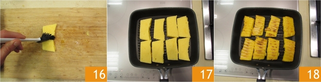 Pinte las rebanadas de polenta con aceite 16, si lo prefiere puede recortarlas antes, y colóquelas en una parrilla bien caliente previamente engrasada 17. Déjelas tostar, sin girarlas durante 2-3 minutos, hasta que estén bien doradas, luego gírelas y deje tostar también el otro lado 18