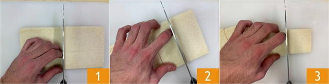 Para preparar los canapés navideños, primero dispone las 5 rebanadas de pan de molde sobre una tabla de cortar y con un cuchillo afilado corta 4 rectángulos a lo largo 1 2; luego divide cada rectángulo por la mitad 3.