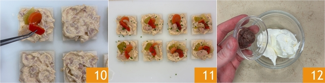 Decora alternando trozos de encurtidos 10 para añadir color y crujiente. Completa con un poco de cebollino finamente picado 11. Reserva estos 8 canapés y prepara los de anchoas. Mezcla la pasta de anchoas con el queso crema en un bol 12.