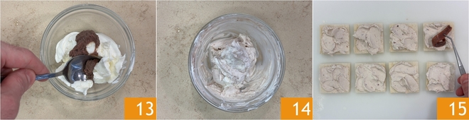 Trabaja la mezcla con una cuchara 13 hasta obtener una crema uniforme 14. Con una espátula, unta la crema de anchoas de manera uniforme sobre otros 8 canapés. Coloca los filetes de anchoas escurridos en el centro 15.