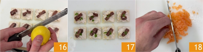 Continúa con una ligera ralladura de limón fresco 16, que proporcionará una nota perfumada y vibrante. Completa con unas hojas de perifollo y reserva 17. Pasa a los canapés de salmón. Corta las lonchas de salmón ahumado en tartar, obteniendo pequeños cubos regulares 18.