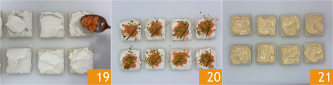 Toma otros 8 trozos de pan y unta una capa de queso fresco en cada uno 19. Coloca una cucharada de tartar de salmón en el centro 19, luego enriquece con una pizca de granillo de pistachos y unos hilos de cebollino para un toque aromático y refinado 20. Reserva y pasa a los canapés con gambas. Unta la mayonesa sobre 8 cuadraditos de pan 21.