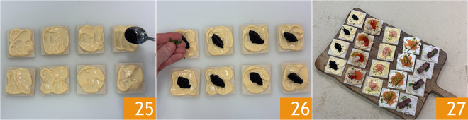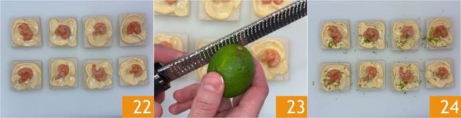 Coloca un par de gambas en el centro de cada canapé 22 y espolvorea con la ralladura de lima 23. Estos también están listos 24.