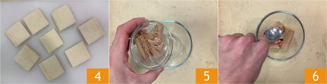 De esta manera, de cada rebanada de pan de molde obtendrás 8 canapés cuadrados 4 para rellenar con cada sabor; en total 40 canapés. Comienza a componer los primeros 8 canapés de atún y encurtidos. Para ello, vierte el atún en un bol 5 y aplástalo con el dorso de una cuchara 6.