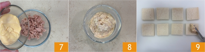 Añade la mayonesa 7 y mezcla hasta obtener una salsa lisa y cremosa 8. Unta la mezcla sobre cada canapé 9.