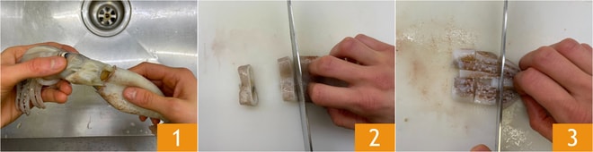 Para preparar los calamares al horno, lo primero es dedicarse a la Cómo limpiar los calamares. Enjuáguelos bajo un chorro de agua corriente, luego separe la cabeza del manto 1. Elimine la pluma, la pequeña varilla de cartílago que está dentro del manto. Retome la cabeza y elimine los ojos, las vísceras y el pico, que se encuentra en el centro de los tentáculos. Quite la piel del manto y de los tentáculos y enjuague nuevamente bajo agua corriente. Corte el manto en rodajas 2 y los tentáculos en trozos 3.