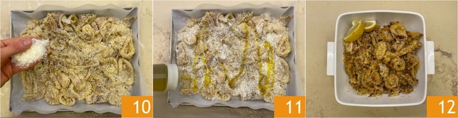 Póngalos en una bandeja cubierta con papel de horno, espolvoree con queso parmesano rallado 10 y rocíe con aceite 11. Hornee en horno estático a 180°C durante 20 minutos, luego en modo grill durante otros 5 minutos. Los calamares al horno están listos para ser degustados 12, si lo desea, después de la cocción, puede sazonarlos con sal al gusto.