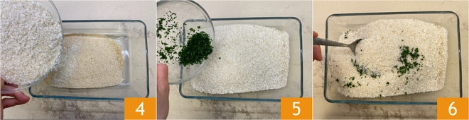 En un bol, ponga el pan rallado, añada el panko 4, el perejil 5 y mezcle todo 6.