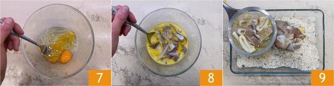 En otro bol, bata los huevos 7, luego pase los calamares primero por el huevo 8 y después por el empanado 9.