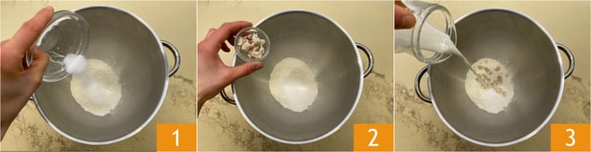 Para preparar la trenza vegana, lo primero que tenéis que hacer es el prefermento. En el bol de la batidora poned la harina, añadid el azúcar 1, la levadura 2 y la leche de soja 3. Amasad con el gancho hasta obtener una masa homogénea.