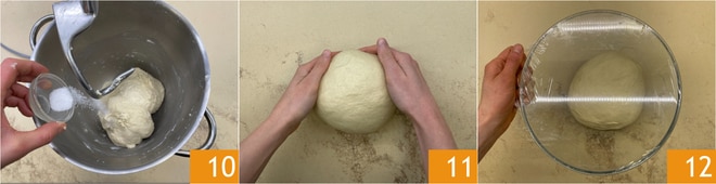 Añadid la sal 10 y amasad nuevamente hasta que se absorba. Luego moved la masa al banco de trabajo, dadle algunos pliegues y formad una bola 11. Trasladadla a un bol, cubridla con film 12 y dejad que leve hasta que doble su tamaño, tardará aproximadamente 2 horas.