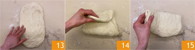 Recuperad la masa y ponedla sobre el banco de trabajo ligeramente enharinado y extendédla con las manos hasta formar un rectángulo 13. Doblád los dos lados cortos hacia el centro 14, luego doblád en dos haciendo coincidir los nuevos lados cortos 15. Extendéd con un rodillo hasta obtener un rectángulo de aproximadamente 0.5 cm de grosor.