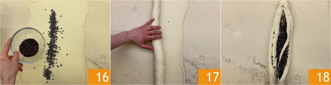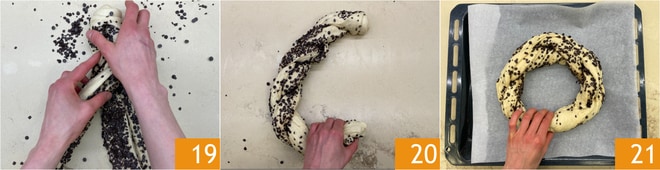 Trenzad los dos bordes de la masa 19. Unid los extremos para formar un círculo 20 y colocadlo en una bandeja cubierta con papel de horno 21. Dejad levar durante 1 hora en el horno apagado con la luz encendida.