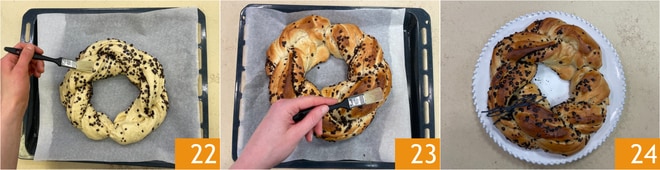 Pincelad la superficie con leche de soja 22 y horneadlo en horno estático precalentado a 190°C durante 25 minutos, en la parte baja del horno. Sacad del horno y volved a pincelar con leche de soja 23. Vuestra trenza vegana está lista para ser disfrutada 24.