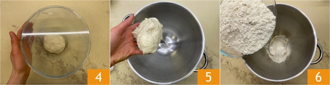 Ponedla en un bol, cubrid con film 4 y dejad que leve hasta que doble su tamaño, tardará aproximadamente 1 hora. Recuperad el prefermento y ponedlo de nuevo en la batidora 5, luego añadid la harina 6.