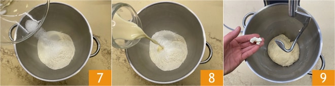 Añadid el azúcar 7, la leche de soja 8 y el extracto de vainilla. Amasad hasta que la masa esté bien cohesionada. Agregad poco a poco la margarina 9, asegurándoos de que se absorba bien antes de añadir más.