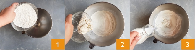 Para realizar las trenzas de nueces y chocolate, vierte la harina en el bol de una batidora equipada con gancho 1, añade la masa madre 2 y vierte la leche 3, pon en marcha la batidora y comienza a trabajar la mezcla.