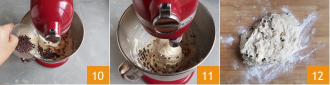 Finalmente, añade también las gotas de chocolate 10, trabaja unos instantes para incorporarlas 11. Transfiere la masa a la superficie de trabajo ligeramente enharinada 12.