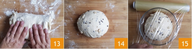 Amasa a mano 13 para formar una bola 14 y colócala en un bol. Cubre con film transparente y deja que fermente al menos 4 horas resguardada de corrientes de aire 15.