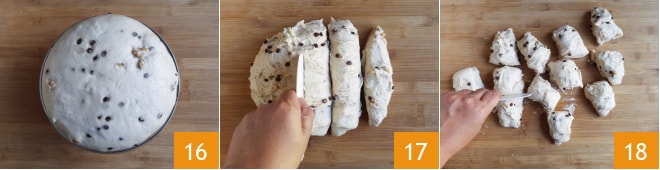 Retoma la masa que habrá duplicado su volumen 16 y divídela en 12 partes iguales ayudándote con una espátula 17 18.