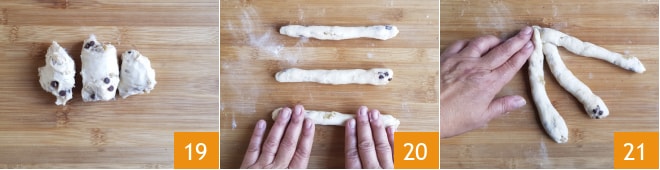 Toma cada pieza y divídela a su vez en tres partes iguales 19. Con cada pieza forma un cordón de unos 20 cm 20. Superpón los extremos presionando ligeramente la masa 21.