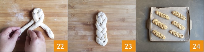 Trenza los tres cordones 22. Deberás obtener una trenza clásica 23. Forra una bandeja con papel de horno y coloca encima las trenzas 24.