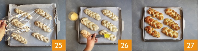 Cubre con film transparente 25. Deja que las trenzas fermenten al menos 8 horas en un lugar cálido. Pasado este tiempo, prepara una mezcla de yema y leche. Pincela con la mezcla las trenzas ya fermentadas 26 y hornea en horno precalentado a 180 °C en el estante medio en modo estático durante unos 25 minutos. Saca las trenzas bien doradas y déjalas enfriar completamente antes de consumirlas 27.