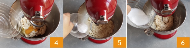 Incorpora el huevo 4, la sal 5 y el azúcar 6.