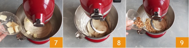Luego añade la mantequilla, un trozo a la vez 7, permitiendo que se incorpore el anterior antes de agregar el siguiente. Trabaja al menos 10 minutos. Cuando la masa esté bien homogénea 8, añade las nueces picadas en trozos grandes 9.