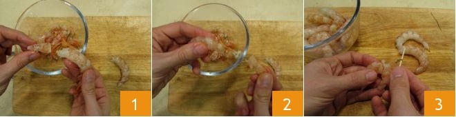Para los 4 canapés con tartar de gambas: limpia las gambas, pelándolas (1-2), luego haz un corte en el lomo y extrae el intestino, el hilo negro, ayudándote quizás con un palillo 3: repite esta operación para la cantidad de gambas de toda la receta.