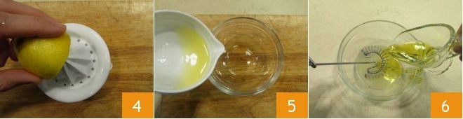 Exprime el jugo del limón y viértelo en un cuenco (4-5); añade también el aceite en hilo emulsionando con un batidor de mano 6. Añade también sal y pimienta al gusto.
