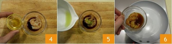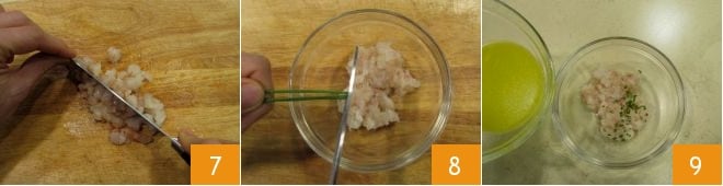 Picar entonces 4 gambas de las que limpiaste 7 y viértalas en otro cuenco; pica el cebollino 8 y añade la emulsión de aceite y limón a las gambas picadas 9. Reserva en el frigorífico cubierto con film hasta el momento de uso.