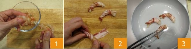 Para los 4 canapés con gambas y bacon: después de pelar las gambas 1, envuélvelas en las rodajas de bacon 2 y dóralas durante 1 minuto por cada lado en una sartén antiadherente 3 de modo que el bacon esté crujiente por fuera.