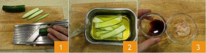 Para los 4 canapés con calabacín y gambas: lava y corta los extremos del calabacín, luego córtalo en rodajas con una mandolina para obtener 4 rodajas bastante finas 1; colócalas en una fuente honda y marínalas con aceite, vinagre de manzana 2, sal y pimienta. Pasados 10-15 minutos, puedes escurrir bien los calabacines y reservarlos. Mientras tanto, prepara también las gambas: coloca 4 colas de gambas en un cuenco, añade la salsa de soja 3