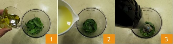 Para las salsas de acompañamiento, empieza con la reducción de albahaca: coloca las hojas de albahaca, añade sal, aceite 1 y jugo de limón 2; luego tritura todo con una batidora de inmersión 3.